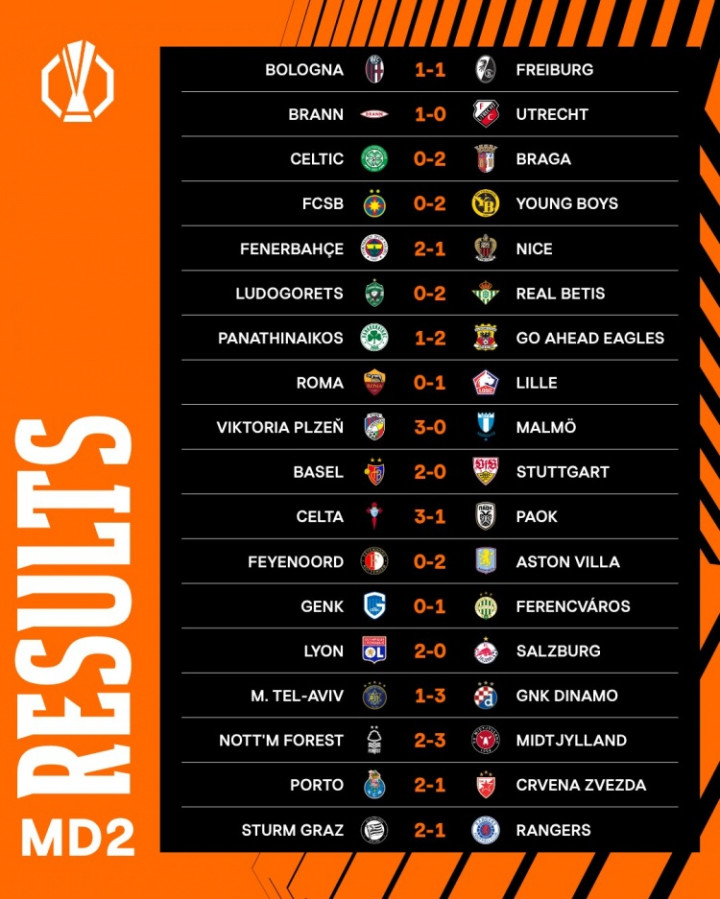 直播吧10月3日讯欧联杯联赛阶段第二轮比赛战罢,罗马0-1不敌里尔,费内巴切2-1战胜尼斯,巴塞尔2-0击败斯图加特,费耶诺德0-2落败于维拉。